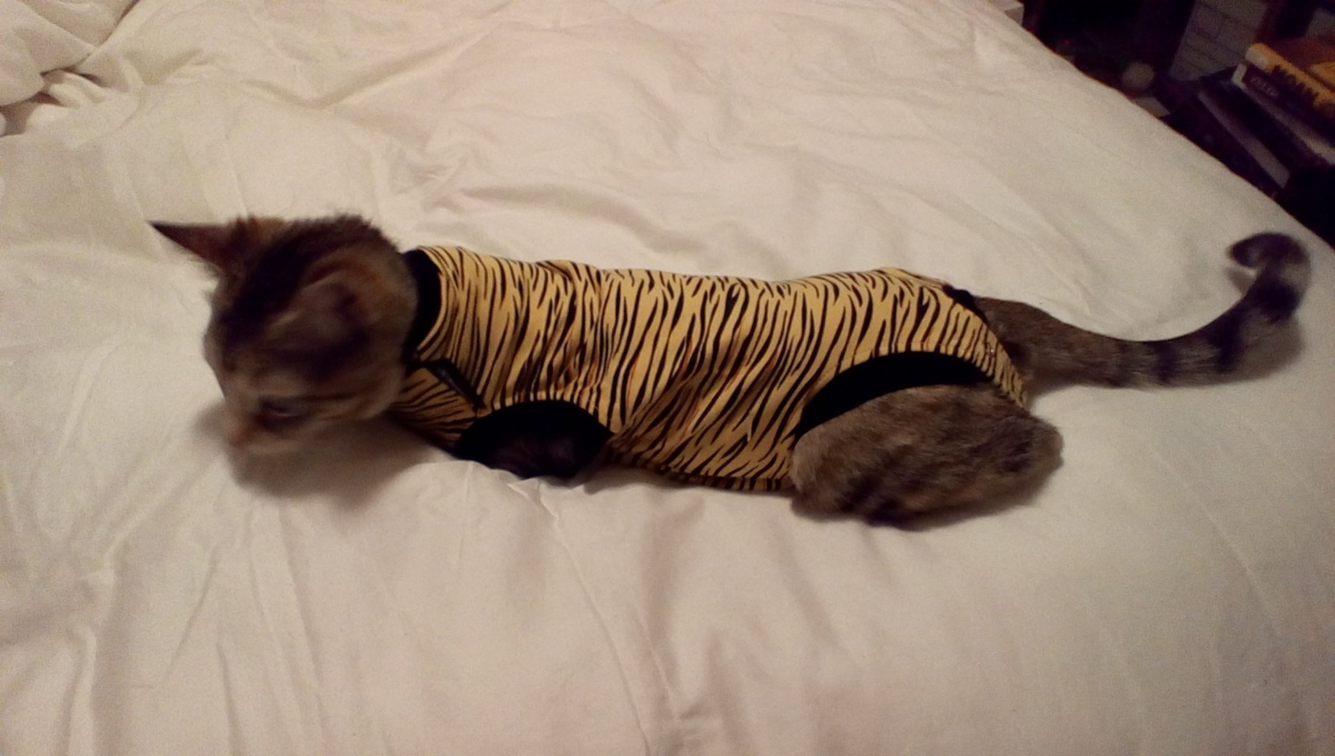 Kitten in a onesie time! Spay day is Friday so I am trying to get her to at least function by short trials. Yes, it's tiger print. She be pimping.
